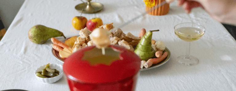 Klassinen juustofondue jaettavana ruokana talvisessa kattauksessa